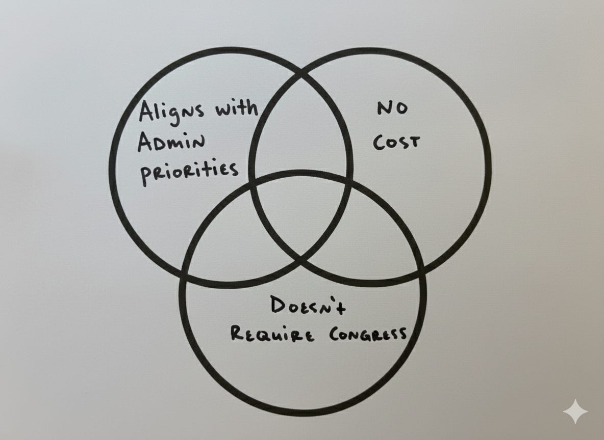 You’re most likely to succeed by aligning policy advice with a sitting administration’s priorities. This is doubly important when regulatory reform is highly centralized in the White House, as it is now.2