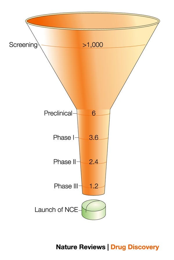 Drug discovery outcomes follow a heavy-tailed distribution: most efforts, even those deemed successful, produce modest results, while a few outliers account for a disproportionate share of both clinical and economic value. Given that success is rare, hard to predict, and potentially enormous, we need to maximize our shots on goal to increase our chances of success. More concretely, that means scaling the number of molecules tested in humans. Expanding the capacity for in-human testing broadens the exploration, increasing the likelihood of uncovering rare, high-impact breakthroughs that drive the most meaningful form of biomedical progress.